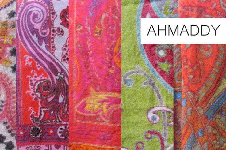 AHMADDY un marchio tedesco di sciarpe dalle fantasie multicolorate che utilizza solo tessuti puri come le sete indiane, il cachemire, la pura lana realizzando un eleganza morbida ed evanescente.